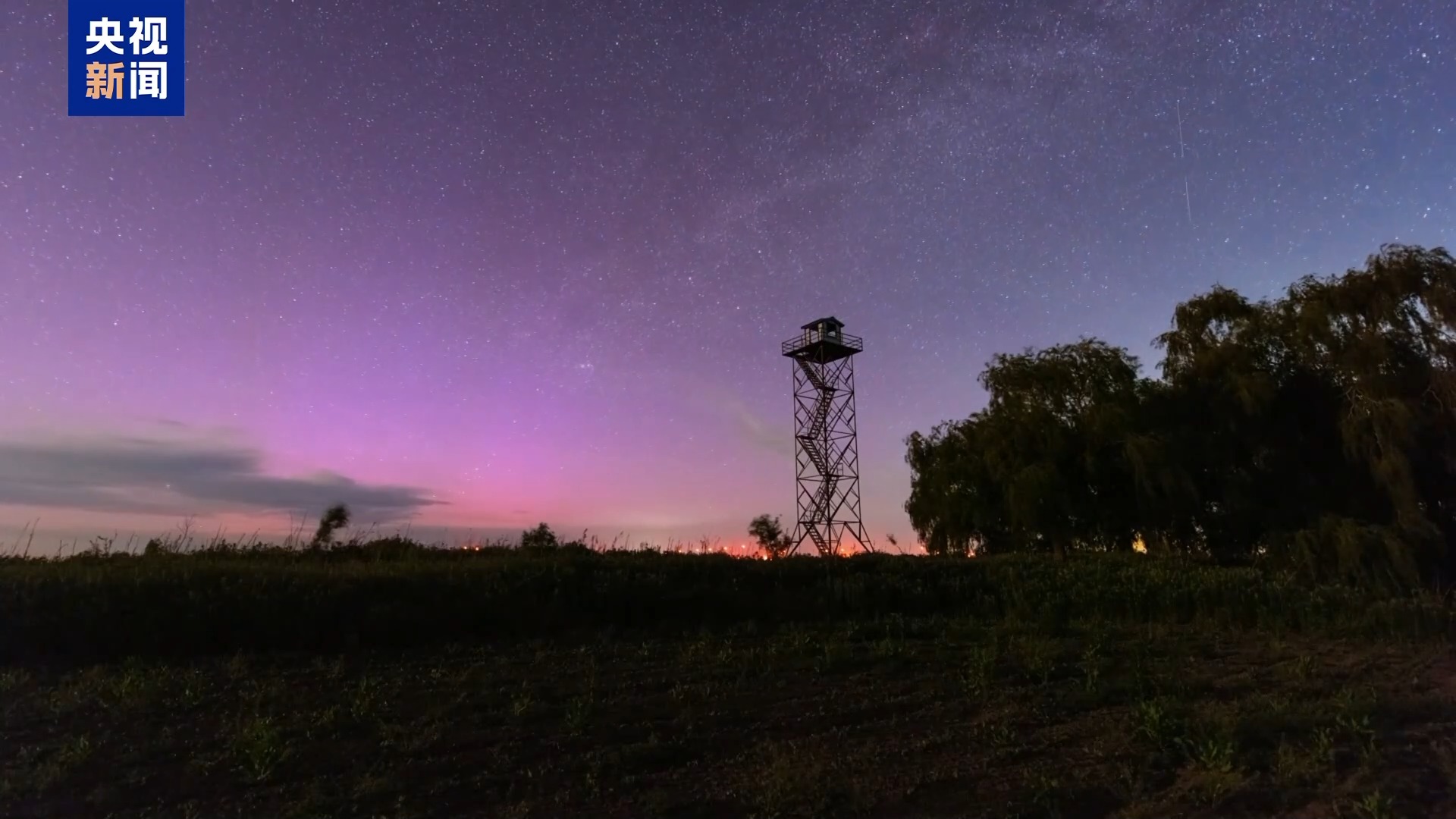 视频显示,凌晨时分的夜空中,天空被极光渲染成了粉紫色,看起来如梦如幻,宛若仙境。