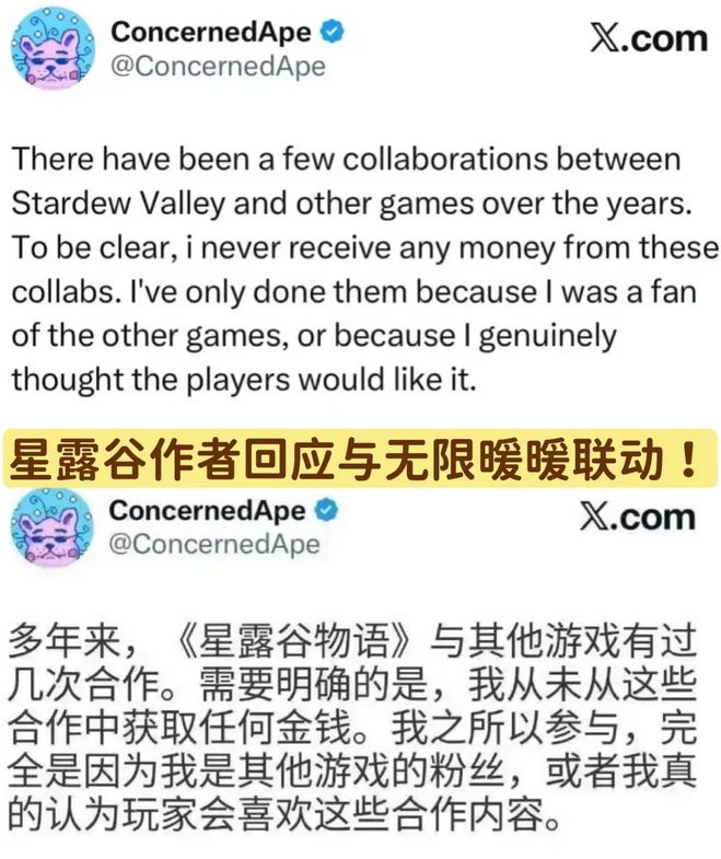 叠纸游戏无限暖暖宣布9月2日开启联动无限暖暖,看到一堆祝尼魔到处跑穿越进暖暖世界了,虽然这俩联动让人想不到,不过好像相性蛮不错的,该种田喽。据星露谷作者在X上表示自己完全没有从联动中捞过钱,仅仅是因为他认为玩家会喜爱这些合作内容,想想作者这几年的免费更新,现在联动也不赚钱真是大圣人啊~