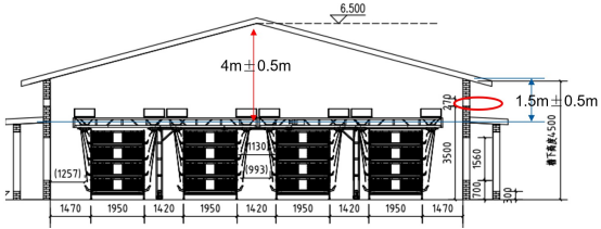 鸡舍建筑需要具有良好的封闭、保温性能,采用密闭式鸡舍设计,以便控制舍内环境,达到节能降耗的目的。标准设计鸡舍总长80~90米,宽15~18米。建议采用装配式钢结构,并根据当地气候条件设计鸡舍保温方案,拼接处应做好密封填充处理,防止外界空气通过拼接缝隙渗透。