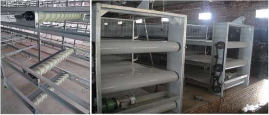 应采用传送带式清粪系统,包括纵向、横向、斜向清粪传送带、动力和控制系统,实现高效及时清理粪尿,防止粪便在舍内滞留。每层笼底均应配备传送带分层清理,由纵向传送带输送到鸡舍尾端,各层笼底传送带粪便经尾端横向和斜向传送带输送至舍外,保证“粪不落地”。清粪传送带宜采用全新聚丙烯材料,具备防静电、抗老化、防跑偏功能(图3)。为避免鸡只接触清粪传送带粪便,应在每层笼上方设置顶网。应适时调整清粪频率,建议粪便日产日清,并集中传输到鸡舍外专用运输车转运出场。根据肉鸡生长期,清粪频率由初始的两天1次逐渐增加,至每天2~4次。粪便及时清除可以避免舍内有害气体和粉尘积累,减少环境污染,还便于集中无害化处理。